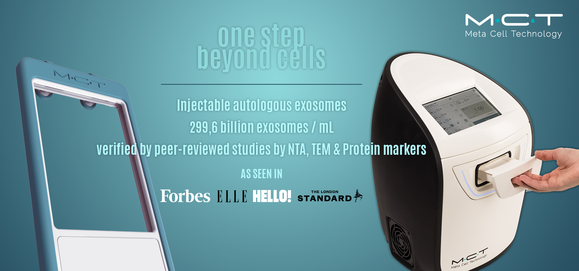 MCT is a medical system that can improve any autologous product, such as PRP or stem cells concentrates, and stimulates the exosome production and deliverance. Through photo- thermal energy it delivers extraordinary growth factor concentration and boosts/enhances cells, filling them with ATP and huge amounts of exosomes.
